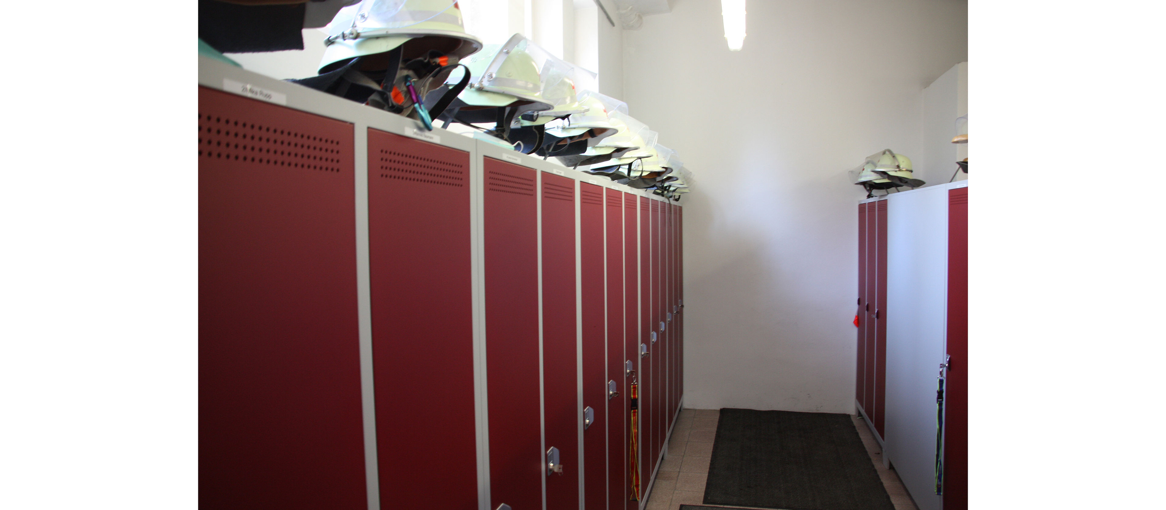 Unsere Umkleiden haben wir durch einen Wanddurchbruch direkt mit der Fahrzeughalle verbunden. Alle Helfer der Bereitschaft haben hier ihre Persönliche Schutzausrüstung in ihrem Spind verstaut um im Einsatzfall sofort darauf zugreifen zu können.